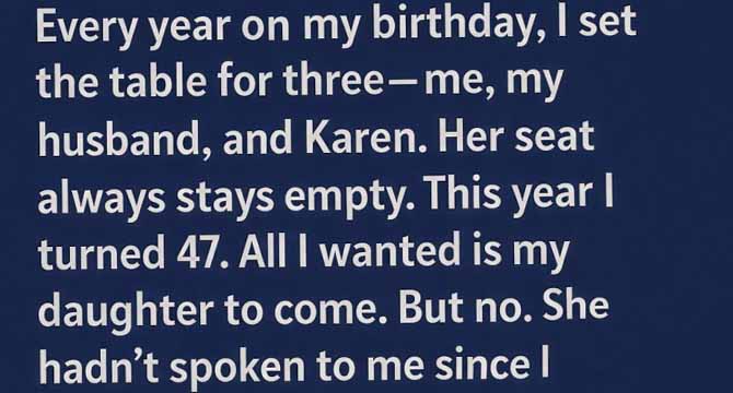On her 47th birthday, she set the table for three—just as she had every year since the silence began. The plates were arranged carefully, the candles lit with intention. Her husband, Brad, sat beside her, offering a gentle smile he hoped might steady her. Across from them, Karen’s chair remained untouched, its emptiness louder than any conversation.