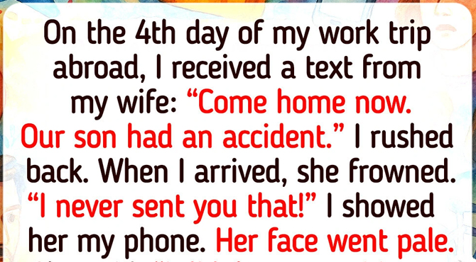 On the 4th day of my work trip abroad, I received a text from my wife: “Come home now. Our son had an accident.” I rushed back. When I arrived, she frowned. “I never sent you that!” I showed her my phone. Her face went pale. She said, “I didn’t text you! I decided our son is fine.”