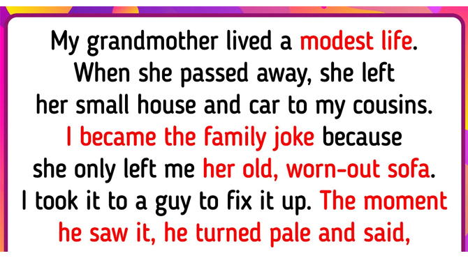 My grandmother lived a modest life. When she passed away, she left her small house and car to my cousins. I became the family joke because she only left me her old, worn-out sofa. I took it to a guy to fix it up.
