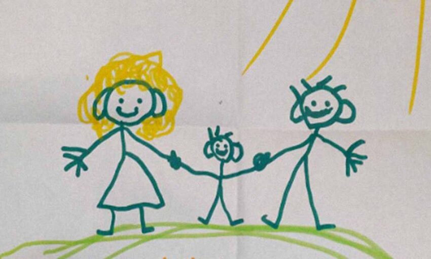 Instead, I unfolded a piece of thick construction paper, crumpled at the corners. There were three stick figures drawn in marker. A little boy in the middle with a Spider-Man backpack at his feet, holding hands with a man and a woman.