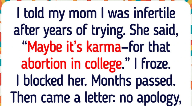 I was diagnosed with infertility after years of trying. It shattered me. I finally opened up to my mom, hoping for comfort. She said, “Well, maybe it’s karma for getting that abortion in college. Life has a way of teaching us lessons.”