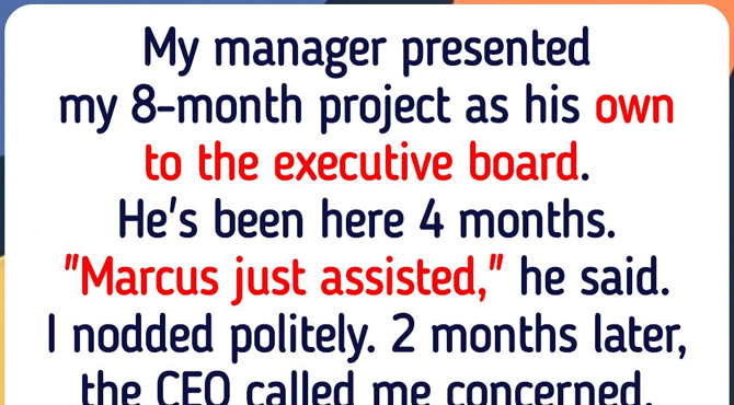 My manager presented my entire project as his own in front of the executive board. I spent 8 months developing it. He joined the team 4 months ago. “Marcus just assisted with some research,” he told everyone. I nodded politely.