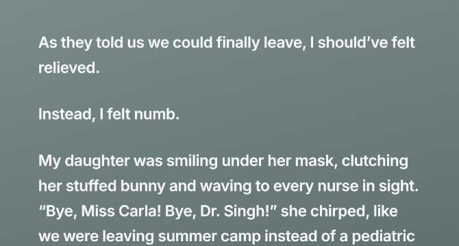 My daughter was smiling under her mask, clutching her stuffed bunny and waving to every nurse in sight. “Bye, Miss Carla! Bye, Dr. Singh!” she chirped, like we were leaving summer camp instead of a pediatric oncology ward.