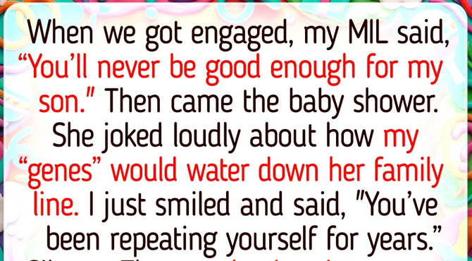“Then came the baby shower. Balloons, gifts, family everywhere. And right on cue, she struck again — this time joking loudly about how my ‘genes’ would water down her family line. Something clicked. I didn’t raise my voice. I didn’t insult her. I just smiled and said, ‘That’s interesting. You said almost the same thing at our wedding — when you told me I’d never be good enough for your son. You’ve been repeating yourself for years.’