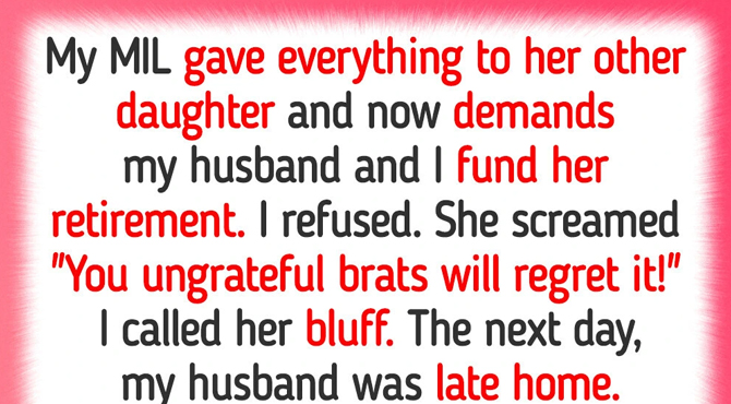 My MIL gave everything to her other daughter and now demands my husband and I fund her retirement. I refused. She screamed, “You ungrateful brats will regret it!” I called her bluff. The next day, my husband was late home. He called me in tears: “You must come to Mom’s house right now. She’s locked herself in the bathroom and won’t come out until we agree to her terms.”