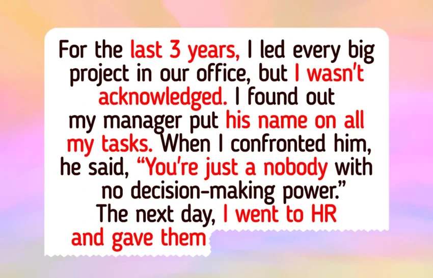 But no matter how we got there, my name never appeared anywhere, and I was never acknowledged for my work. At first, I was confused, but after doing a little digging, I found out that my manager put his name on all of my tasks.