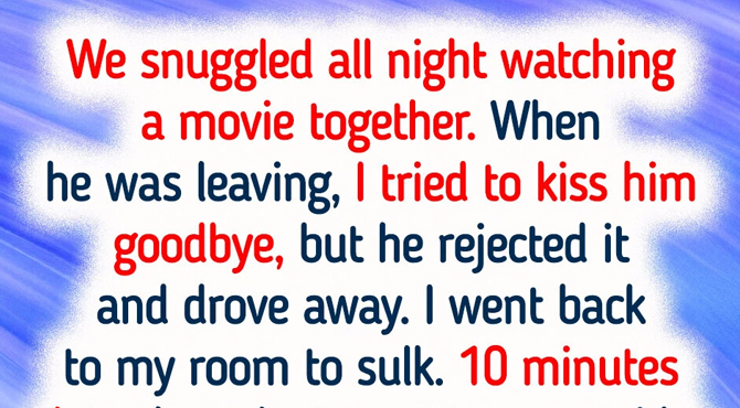 We snuggled all night watching a movie together. When he was leaving, I tried to kiss him goodbye, but he rejected it and drove away. I went back to my room to sulk. 10 minutes later he asks to meet me outside. I get outside, and he shouts in disbelief, “Wait, were you trying to kiss me? Does that mean you like me?” Boy had legit driven away and called his friend because he was confused and thought I was giving mixed messages about liking him or not.