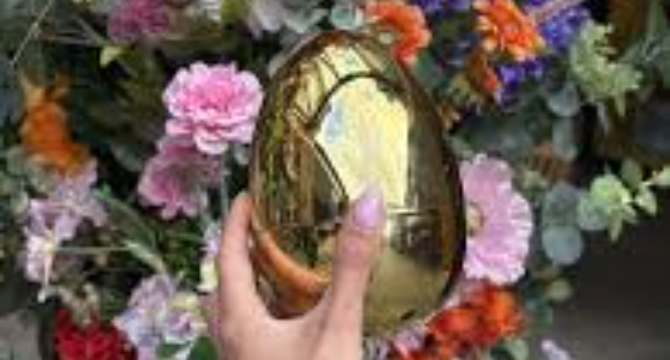 She set the knife down and reached into her purse. She pulled out a large golden egg, so large that she held it with both hands as she walked around the table, past Mark, past Dana, past two family friends, and stopped beside me.