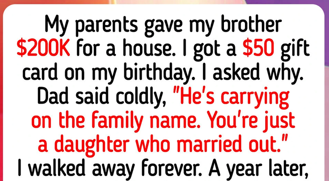 My parents gave my brother $200K for a house. I got a $50 gift card on my birthday. I asked why. Dad said coldly, “He’s carrying on the family name. You’re just a daughter who married out.” I walked away forever.