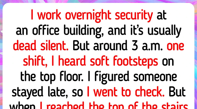 I work overnight security at an office building, and most nights it’s dead silent. One shift, around 3 a.m., I started hearing soft footsteps on the top floor. I figured someone stayed late or fell asleep at their desk, so I went up to check.